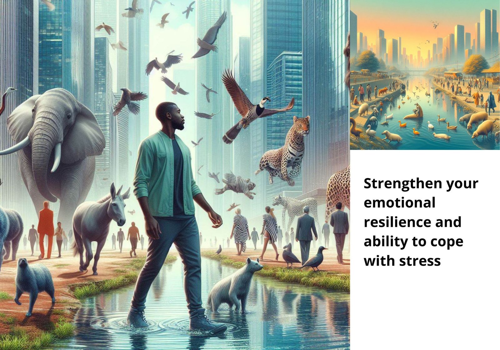 Fone prieš horizontą iškilusi didinga kalnų grandinė, pabrėžianti simbiozinį miesto kraštovaizdžio ir supančios gamtinės aplinkos ryšį. Per miestą teka vingiuota upė, kupina gyvybės, įskaitant žuvis, antis ir gulbes, pabrėžiant vandens kelių svarbą miesto ekosistemose.