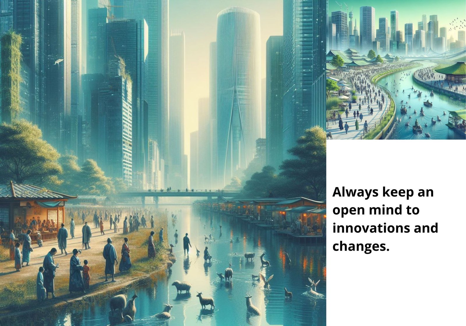 Fone prieš horizontą iškilusi didinga kalnų grandinė, pabrėžianti simbiozinį miesto kraštovaizdžio ir supančios gamtinės aplinkos ryšį. Per miestą teka vingiuota upė, kupina gyvybės, įskaitant žuvis, antis ir gulbes, pabrėžiant vandens kelių svarbą miesto ekosistemose.