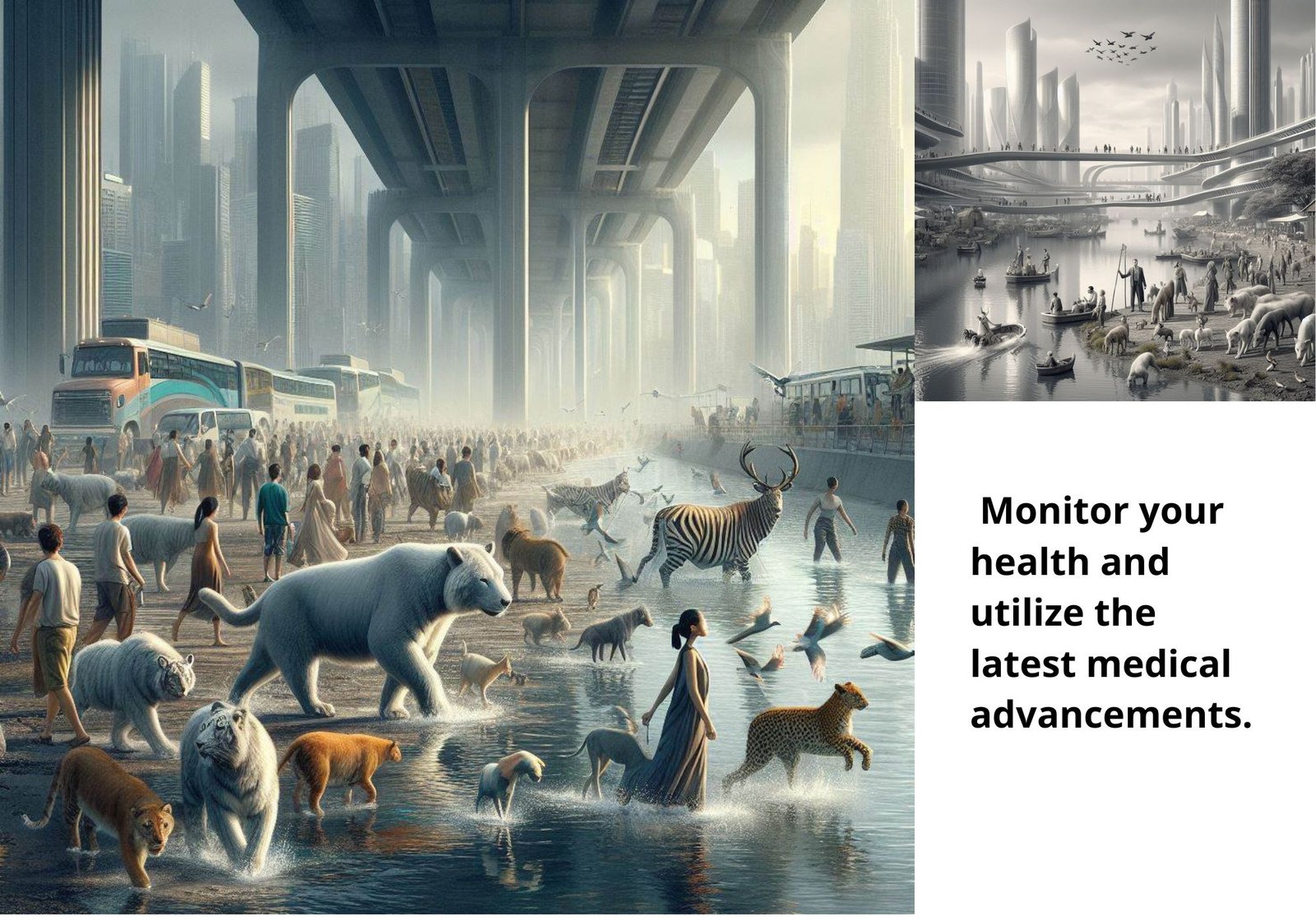 Fone prieš horizontą iškilusi didinga kalnų grandinė, pabrėžianti simbiozinį miesto kraštovaizdžio ir supančios gamtinės aplinkos ryšį. Per miestą teka vingiuota upė, kupina gyvybės, įskaitant žuvis, antis ir gulbes, pabrėžiant vandens kelių svarbą miesto ekosistemose.